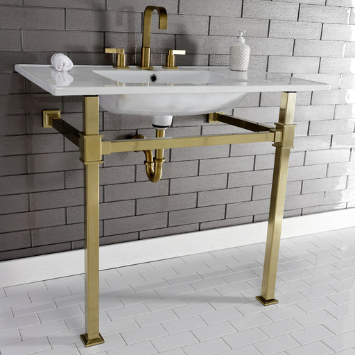 Kingston BrassMonarch KVPB37228Q7 37-Inch Ceramic Console Sink with Stainless Steel Legs (8-Inch, 3-Hole), White/Brushed Brass With a beautiful ceramic counte...