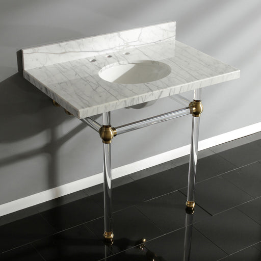 Kingston BrassTempleton KVPB3630MA7 36-Inch Carrara Marble Vanity Top with Acrylic Legs (8-Inch, 3-Hole), Carrara Marble White/Brushed Brass With a beautiful ...