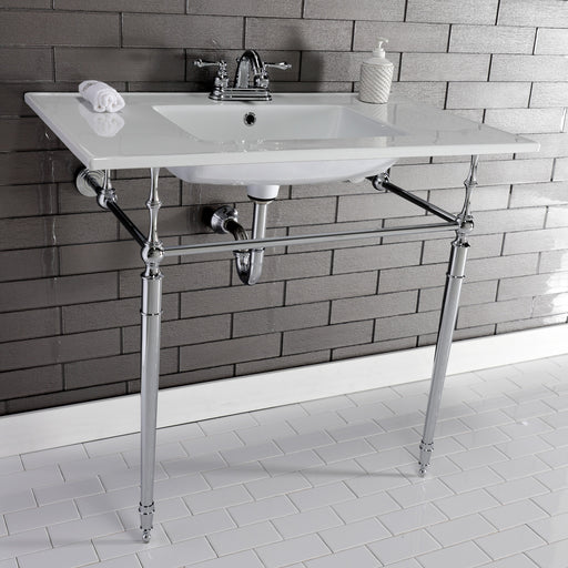 Kingston BrassEdwardian KVPB37227W4CP 37-Inch Ceramic Console Sink with Brass Legs (4-Inch, 3-Hole), White/Polished Chrome With a beautiful ceramic counter to...