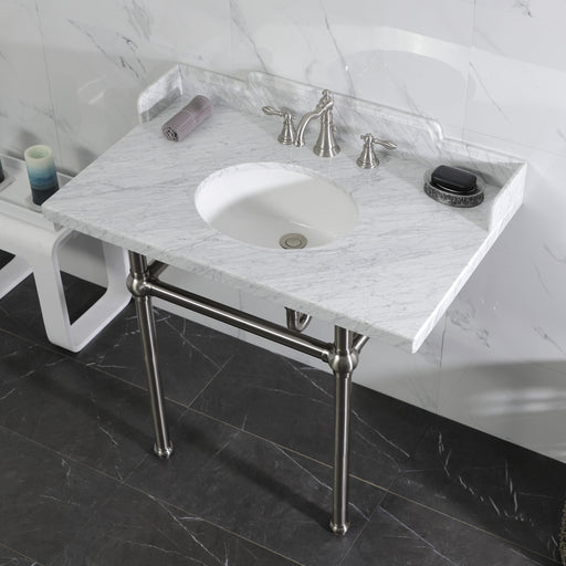 Kingston BrassDreyden LMS36M86ST 36-Inch Carrara Marble Console Sink with Stainless Steel Legs (8-Inch, 3-Hole), Carrara Marble White/Polished Nickel With a b...