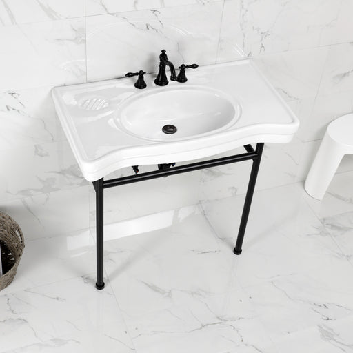 Kingston BrassMonarch KVPB25224Q0 25-Inch Ceramic Console Sink with Stainless Steel Legs (4-Inch, 3-Hole), White/Matte Black With a beautiful ceramic counter ...
