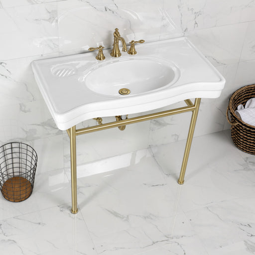 Kingston BrassMonarch KVPB25224Q7 25-Inch Ceramic Console Sink with Stainless Steel Legs (4-Inch, 3-Hole), White/Brushed Brass With a beautiful ceramic counte...