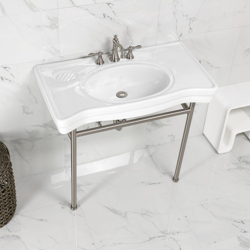 Kingston BrassBristol VPB28140W88 36-Inch Ceramic Console Sink with Stainless Steel Legs (8-Inch, 3-Hole), White/Brushed Nickel With a beautiful ceramic count...