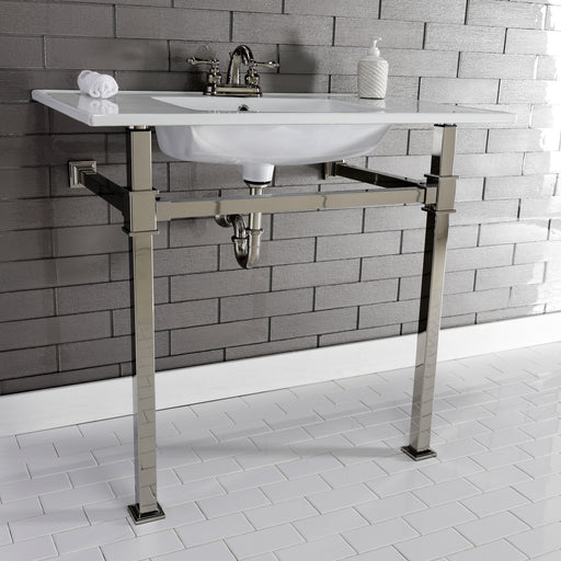Kingston BrassMonarch KVPB37224Q6 37-Inch Ceramic Console Sink with Stainless Steel Legs (4-Inch, 3-Hole), White/Polished Nickel With a beautiful ceramic coun...