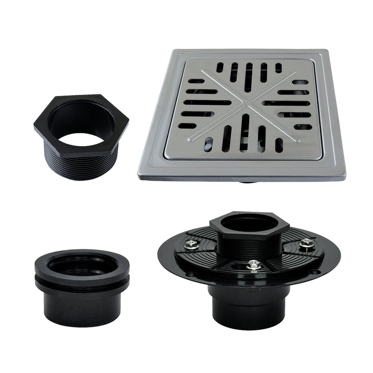 The Watercourse collection by Kingston Brass offers a comprehensive drain kit that consists of an ABS flange, an adapter, and a shower drain grid. In addition, the kit includes a hair catcher to facilitate easy maintenance. The drain grid is constructed from durable brass material to ensure long-lasting performance. This particular 4 x 4 model features linear cutouts arranged in a geometric pattern design, adding a traditional whimsical touch to any space.