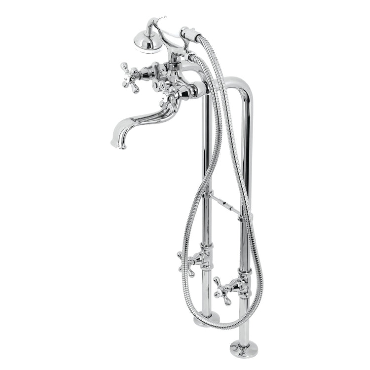 Distinguished for its elegance, sophistication, and exquisite architecture, this freestanding tub faucet is the perfect fixture for any traditional home. Allow it to both complement your freestanding tub and act as a beautiful ornamental piece in your bathroom. As the perfect accompaniment to your tub, the Kingston freestanding clawfoot tub faucet with water supply lines and valves will surely complete your refined bathroom decorum with the help of its premium, glistening polished chrome finish and hand shower. The solid brass construction also makes for a heavy, quality made product. Includes hand shower with porcelain handle and 59-inch hose.