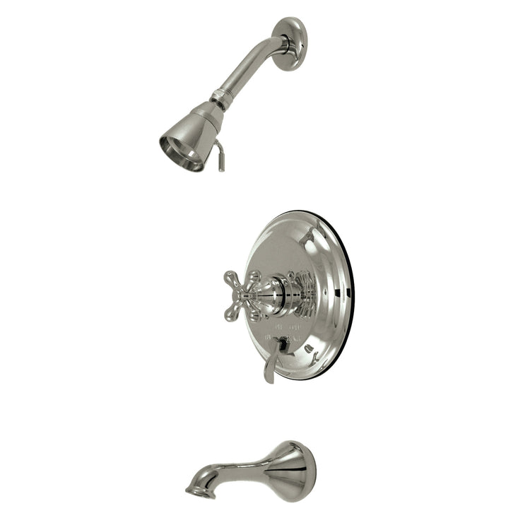The traditional charm of this tub and shower faucet brings classical artistry to your home. Complete with an easy-to-turn cross handle, an optimum bathing experience awaits. Enjoy the sturdy brass construction and premium brushed nickel finish for a fixture that will last for years to come. A pressure balanced valve is included for safety and protection against accidental burns.