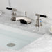 This faucet tastefully interweaves top-notch ergonomic design and the sheen of contemporary simplicity with its black silicone rubber coated handles and cylindrical facets. The Kaiser widespread bathroom faucet with pop-up drain and its featured sturdy brass construction and premium brushed nickel finish are guaranteed to glamorize your home's modern ensemble for years to come. Ideal for more spacious bathrooms, widespread faucets feature a 3-hole installation at 8" center to center. Furnish your home surrounding with the modern flair of this fixture. A matching finish drain is also included.