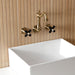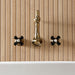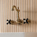 Crafted in commendations to English nobility, the exemplary design of this faucet manifests regality and elegance with its black porcelain handles. Attached to the wall behind your sink, the horizontal pop adds a stunning element to your bathroom design. Clean-up is also made a breeze as counter space is cleared up. The Duchess two-handle wall mount bathroom faucet and its featured sturdy brass construction and premium antique brass finish are guaranteed to glamorize your home's traditional ensemble for years to come. Glamorize your home today with the traditional elegance of this faucet.