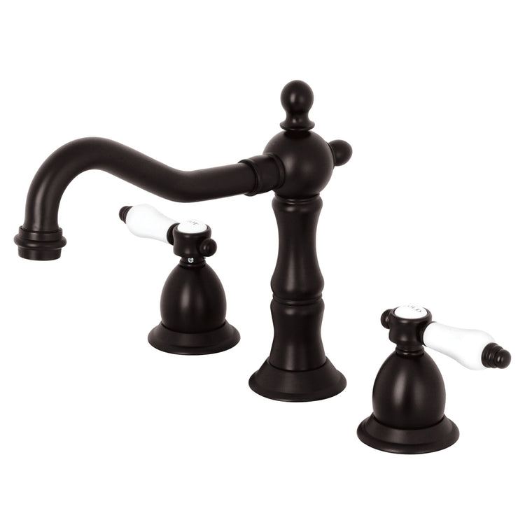 The graceful elegance of timeless design is beautifully merged between British flair and Victorian delicacy within this faucet's white porcelain levers. Ideal for more spacious bathrooms, widespread faucets are more spread apart and feature a 3-hole installation. The Bel-Air 8" Widespread Bathroom Faucet, with its featured sturdy brass construction and premium oil rubbed bronze finish, are guaranteed to glamorize your home's traditional ensemble for years to come. Varnish your bathroom with this state-of-the-art fixture. A matching finish drain is also included.