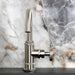 This faucet's modern features create a bold and edgy design in your bathroom. The Wendell single-handle bathroom faucet with knurled handle and push pop-up drain and its featured sturdy brass construction and premium brushed nickel finish are guaranteed to glamorize your home's modern ensemble for years to come. Single-hole bathroom faucets provide a more streamlined look. Also, they will allow your bathroom to appear more spacious with the limited counter space they require. A matching finish drain is also included.