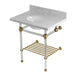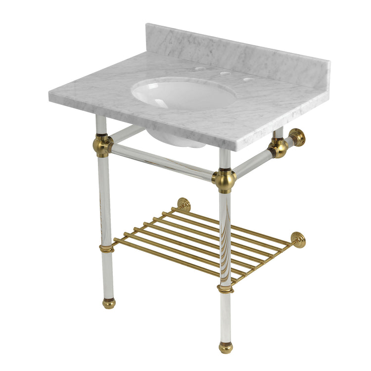 Kingston Tulare KVPB30MAB7 - Templeton 30-Inch Carrara Marble Console Sink with Acrylic Legs and Shelf (8-Inch, 3-Hole), Carrara Marble White/Brushed Brass