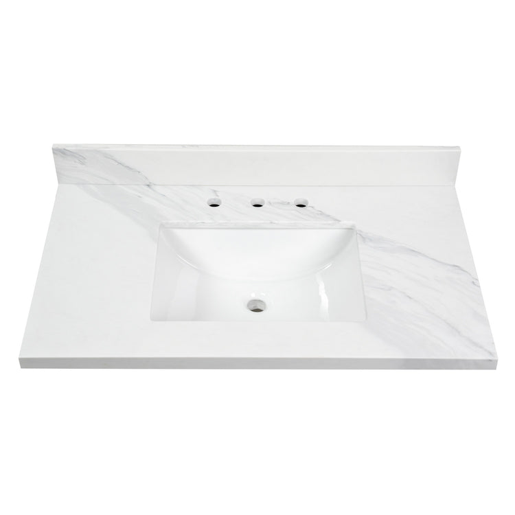 Crafted from exquisite white stone, a cutting-edge material renowned for its remarkable properties, this 37" x 22" vanity top with its Carrara Marble pattern exudes elegance and sophistication. With its preinstalled undermount square sink, this vanity top becomes a perfect complement to any bathroom decor when combined with suitable cabinet or console legs. This vanity top is predrilled at 8” center to center to accommodate a widespread faucet and it includes a wall support bracket for added safety.