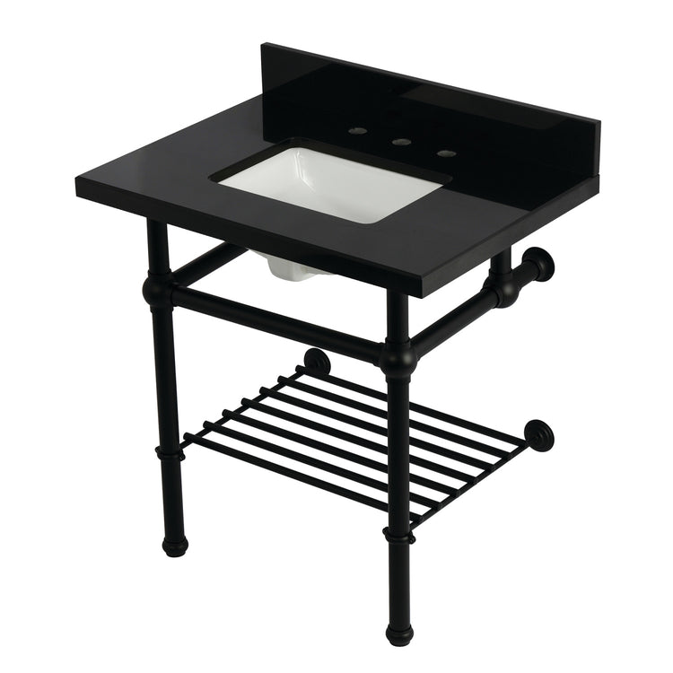 Kingston Heirloom KVPK3030KBSQB0 - Templeton 30-Inch Black Granite Console Sink with Brass Legs and Shelf (8-Inch, 3-Hole), Black Granite/Matte Black