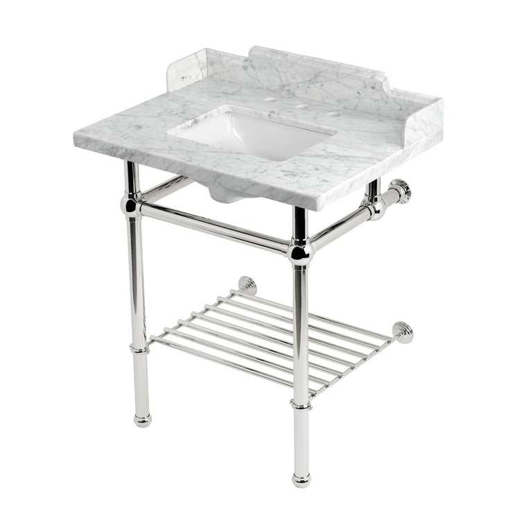 Kingston Heirloom LMS30MBSQB6 - Pemberton 30-Inch Carrara Marble Console Sink with Brass Legs and Shelf (8-Inch, 3-Hole), Carrara Marble White/Polished Nickel