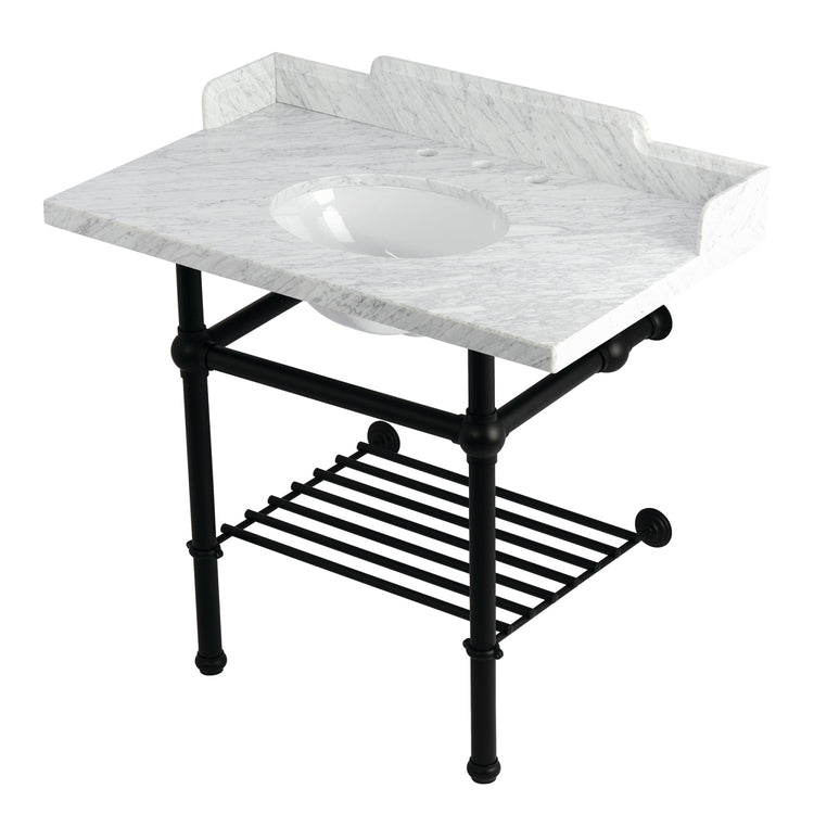 Kingston Heirloom LMS3630MBB0 - Pemberton 36-Inch Carrara Marble Console Sink with Brass Legs and Shelf (8-Inch, 3-Hole), Carrara Marble White/Matte Black