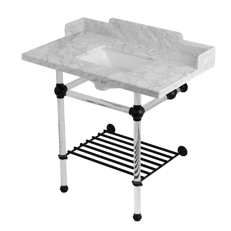 Kingston Tulare LMS36MASQB0 - Pemberton 36-Inch Carrara Marble Console Sink with Acrylic Legs and Shelf (8-Inch, 3-Hole), Carrara Marble White/Matte Black