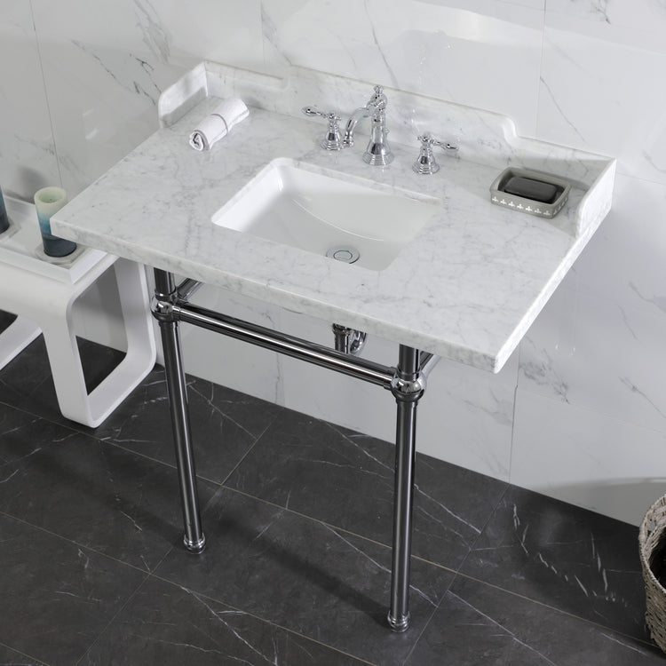Kingston Heirloom LMS36MBSQ1 - Pemberton 36-Inch Carrara Marble Console Sink with Brass Legs (8-Inch, 3-Hole), Carrara Marble White/Polished Chrome