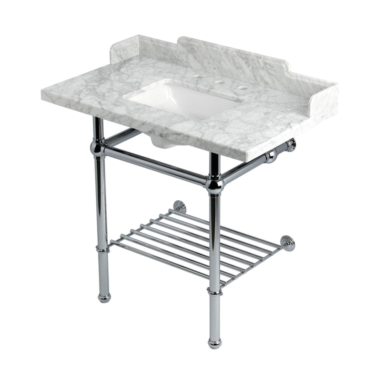 Kingston Heirloom LMS36MBSQB1 - Pemberton 36-Inch Carrara Marble Console Sink with Brass Legs and Shelf (8-Inch, 3-Hole), Carrara Marble White/Polished Chrome