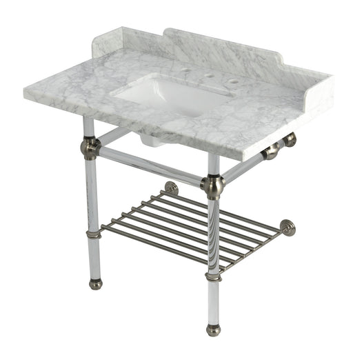 Original price $2,579.85Original price $2,579.85 - Original price $2,579.85Original price $2,579.85Current price $1,934.89$1,934.89 - $1,934.89Current price $1,934.89| /Kingston Tulare KVPB3630MASQB8 - Templeton 36-Inch Carrara Marble Console Sink with Acrylic Legs and Shelf (8-Inch, 3-Hole), Carrara Marble White/Brushed Nickel