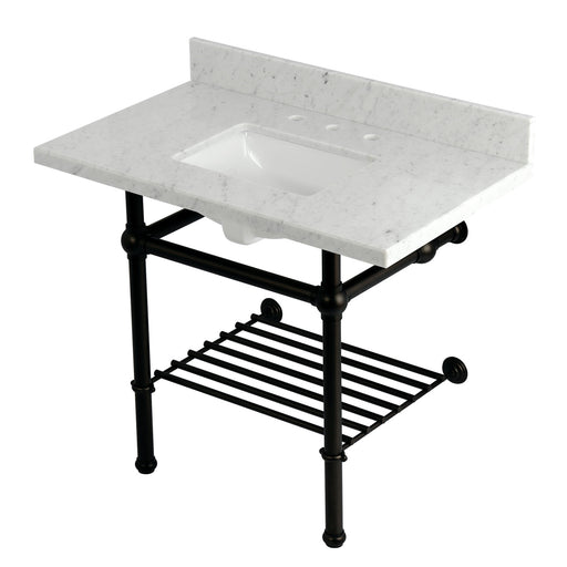 Original price $2,569.85Original price $2,569.85 - Original price $2,569.85Original price $2,569.85Current price $1,927.39$1,927.39 - $1,927.39Current price $1,927.39| /Kingston Heirloom KVPB3630MBSQB5 - Templeton 36-Inch Carrara Marble Console Sink with Brass Legs and Shelf (8-Inch, 3-Hole), Carrara Marble White/Oil Rubbed Bronze