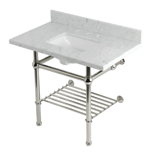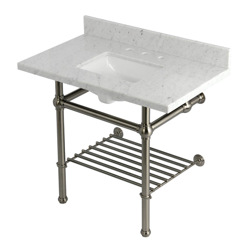 Original price $2,569.85 - Original price $2,569.85Original price $2,569.85$2,569.85$2,569.85 - $2,569.85Current price $2,569.85| /Kingston Heirloom KVPB3630MBSQB8 - Templeton 36-Inch Carrara Marble Console Sink with Brass Legs and Shelf (8-Inch, 3-Hole), Carrara Marble White/Brushed Nickel