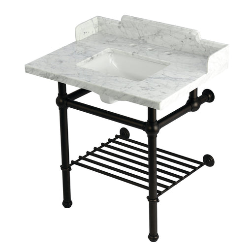 Original price $3,319.85Original price $3,319.85 - Original price $3,319.85Original price $3,319.85Current price $2,489.89$2,489.89 - $2,489.89Current price $2,489.89| /Kingston Heirloom LMS3030MBSQB5 - Pemberton 30-Inch Carrara Marble Console Sink with Brass Legs and Shelf (8-Inch, 3-Hole), Carrara Marble White/Oil Rubbed Bronze
