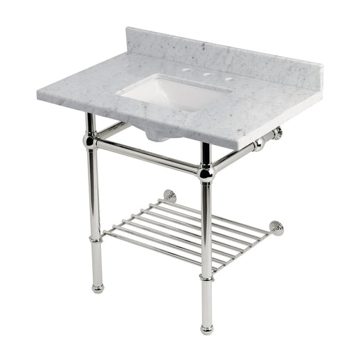 Original price $2,639.85 - Original price $2,639.85Original price $2,639.85$2,639.85$2,639.85 - $2,639.85Current price $2,639.85| /Kingston Heirloom KVPB30MBB6 - Templeton 30-Inch Carrara Marble Console Sink with Brass Legs and Shelf (8-Inch, 3-Hole), Carrara Marble White/Polished Nickel