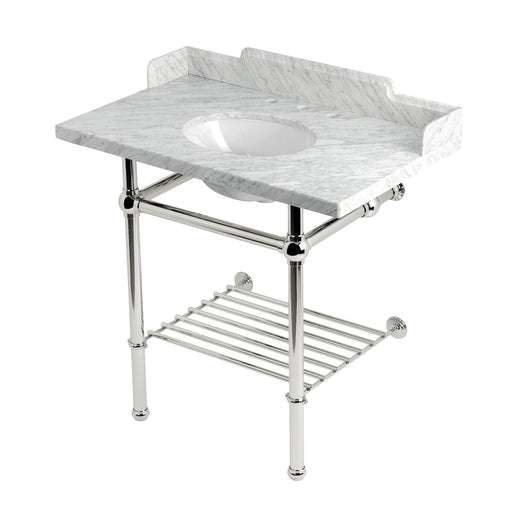 Original price $2,734.85 - Original price $2,734.85Original price $2,734.85$2,734.85$2,734.85 - $2,734.85Current price $2,734.85| /Kingston Heirloom KVPB36MBSQB6 - Templeton 36-Inch Carrara Marble Console Sink with Brass Legs and Shelf (8-Inch, 3-Hole), Carrara Marble White/Polished Nickel