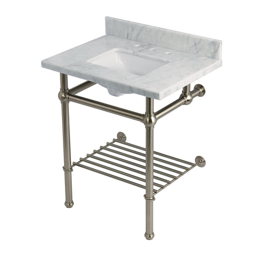 Original price $3,289.85Original price $3,289.85 - Original price $3,289.85Original price $3,289.85Current price $2,467.39$2,467.39 - $2,467.39Current price $2,467.39| /Kingston Heirloom LMS30MBSQB8 - Pemberton 30-Inch Carrara Marble Console Sink with Brass Legs and Shelf (8-Inch, 3-Hole), Carrara Marble White/Brushed Nickel