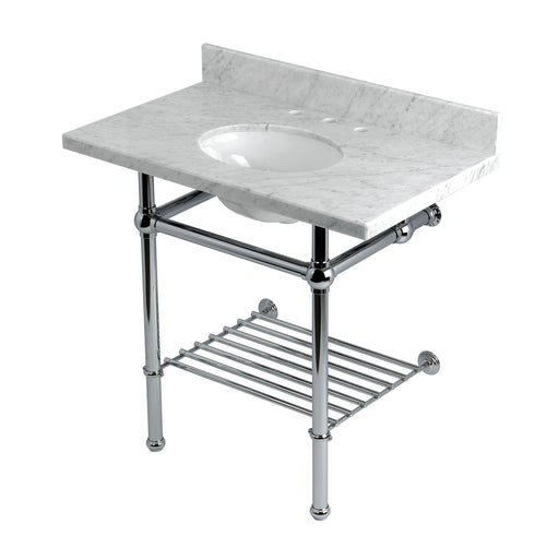 Original price $2,324.85 - Original price $2,324.85Original price $2,324.85$2,324.85$2,324.85 - $2,324.85Current price $2,324.85| /Kingston Heirloom KVPB30MBSQB1 - Templeton 30-Inch Carrara Marble Console Sink with Brass Legs and Shelf (8-Inch, 3-Hole), Carrara Marble White/Polished Chrome