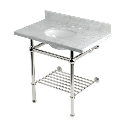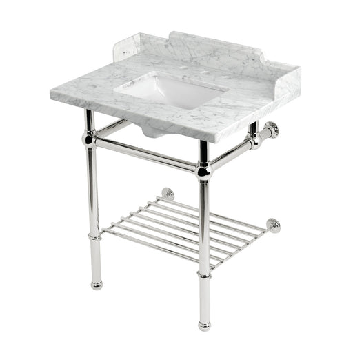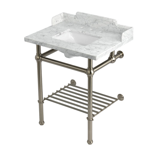 Original price $2,414.85 - Original price $2,414.85Original price $2,414.85$2,414.85$2,414.85 - $2,414.85Current price $2,414.85| /Kingston Heirloom KVPB30MBSQB8 - Templeton 30-Inch Carrara Marble Console Sink with Brass Legs and Shelf (8-Inch, 3-Hole), Carrara Marble White/Brushed Nickel