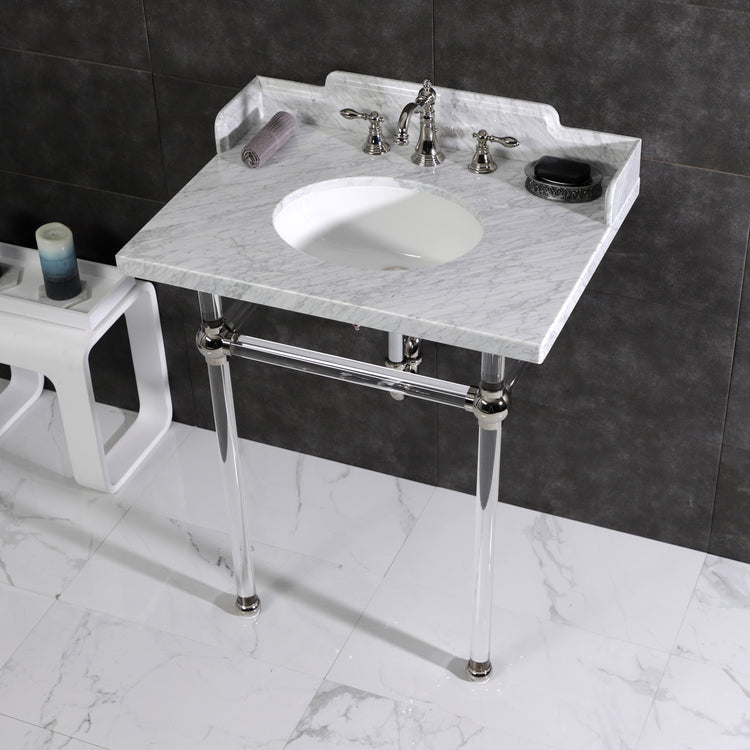 Pemberton LMS30MA6 30-Inch Carrara Marble Console Sink with Acrylic Legs (8-Inch, 3-Hole), Carrara Marble White/Polished Nickel