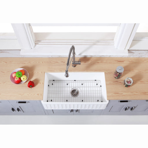 Kingston BrassArcticstone KGKFA301810CD 30-Inch Solid Surface White Stone Apron-Front Single Bowl Farmhouse Kitchen Sink with Strainer and Grid, Matte White/Bru...