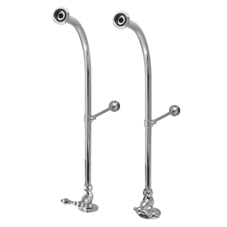 From Kingston Brass, this polished chrome freestanding water supplies feature a 22-13/16 inch height with a 13-3/4 inch length to the wall. The freestanding supply lines have an adjustable wall brace, allowing for a higher or lowered height. All are constructed from high quality brass to ensure reliability and durability.