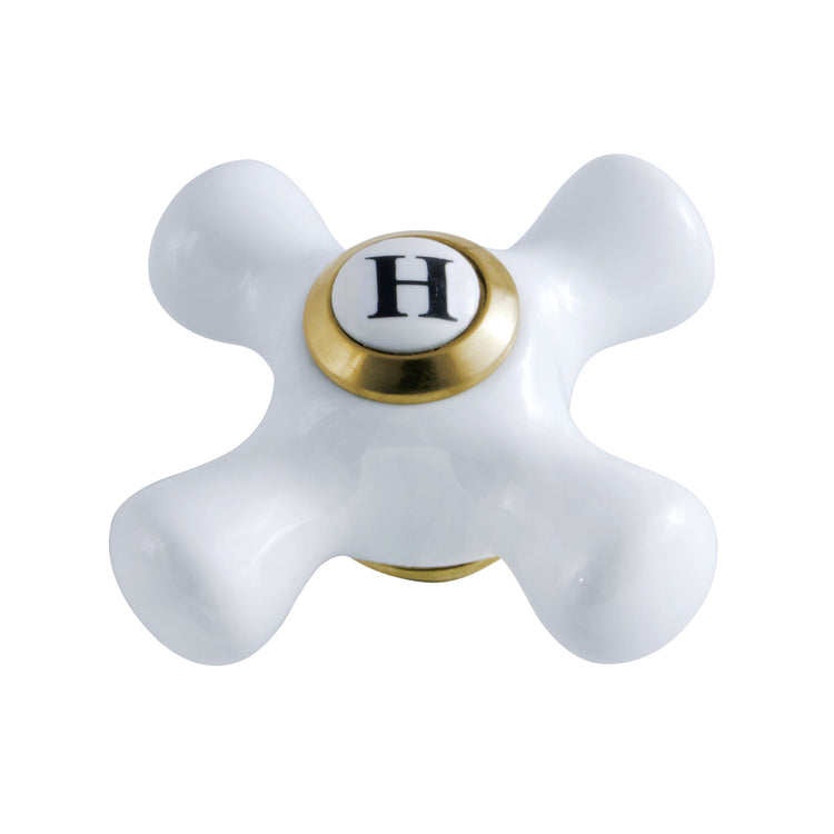 The Kingston Brass porcelain cross handle provides effortless mobility and style for easy adjustment of water temperature and volume. Use as a replacement part to match with brushed brass fixtures.