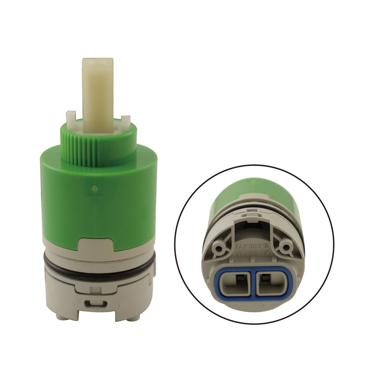 The ceramic disc cartridge is the heart of the faucet, controlling its temperature and water flow. Internally, two opposing discs made out of ceramic carbide rotate to control the flow of water. Because ceramic carbide is impervious to friction, it can last for many years before needing replacement.