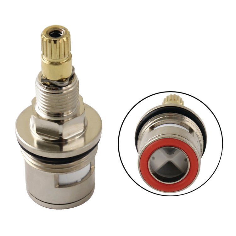 The ceramic disc cartridge is the heart of the faucet, controlling its temperature and water flow. Internally, two opposing discs made out of ceramic carbide rotate to control the flow of water. Because ceramic carbide is impervious to friction, it can last for many years before needing replacement. This hot-side stem cartridge rotates counter-clockwise with 3/8" x 16 spline broach.