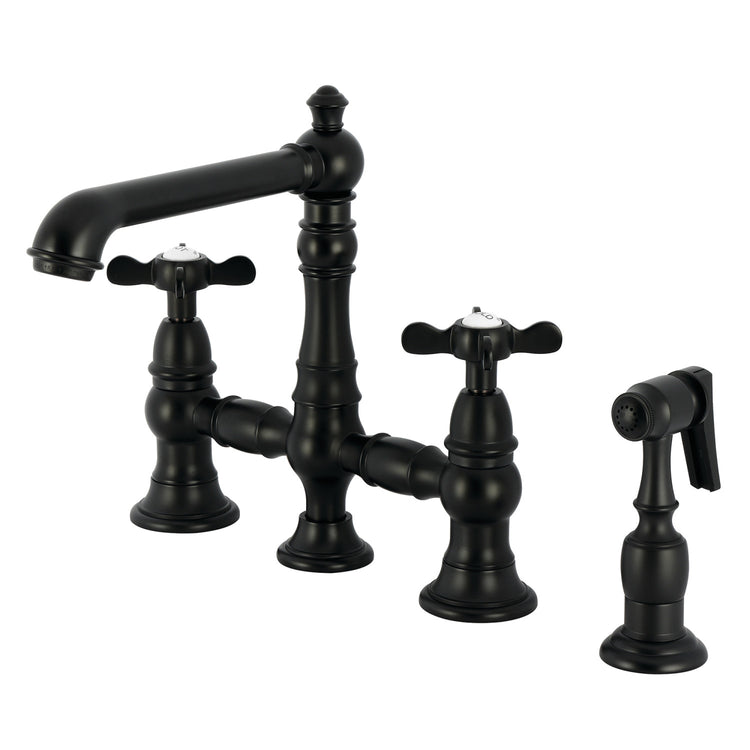 Kingston Tulare KS7270BEXBS - Essex Two-Handle 4-Hole Deck Mount Bridge Kitchen Faucet with Brass Sprayer, Matte Black