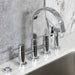 From the Concord collection by Kingston Brass we are excited to introduce this contemporary bridge faucet. Featuring a swivel gooseneck ribbon spout and cylindrical lever handles, this faucet exudes a contemporary minimalist allure. Crafted from solid brass and equipped with a ceramic cartridge this faucet is designed to provide years of trouble free service, the brass side spray adds elegant functionality to this exceptional faucet.