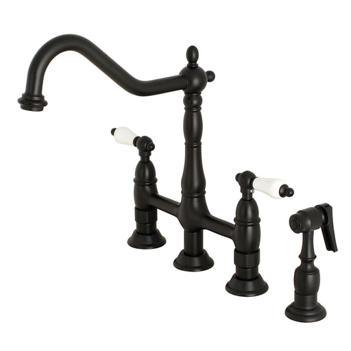 Kingston BrassKingston Heirloom KS1270PLBS - Heritage Two-Handle 4-Hole Deck Mount Bridge Kitchen Faucet with Brass Sprayer, Matte Black A lavish spark of tra...