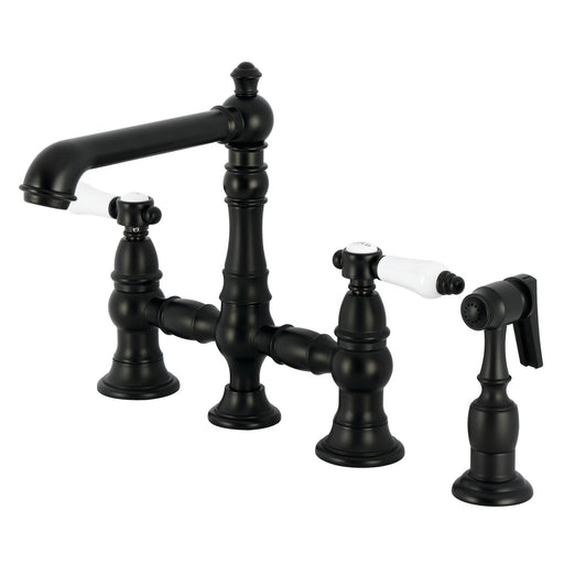 Original price $939.95Original price $939.95 - Original price $939.95Original price $939.95Current price $704.96$704.96 - $704.96Current price $704.96| /Kingston Tulare KS7270BPLBS - Bel-Air Two-Handle 4-Hole Deck Mount Bridge Kitchen Faucet with Brass Sprayer, Matte Black