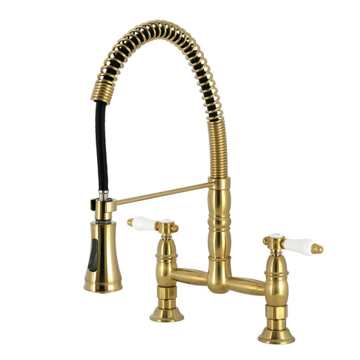 Original price $779.95 - Original price $779.95Original price $779.95$779.95$779.95 - $779.95Current price $779.95| /Kingston Tulare GS1277BPL - Bel-Air Double-Handle 2-Hole Deck-Mount Pre-Rinse Bridge Kitchen Faucet, Brushed Brass