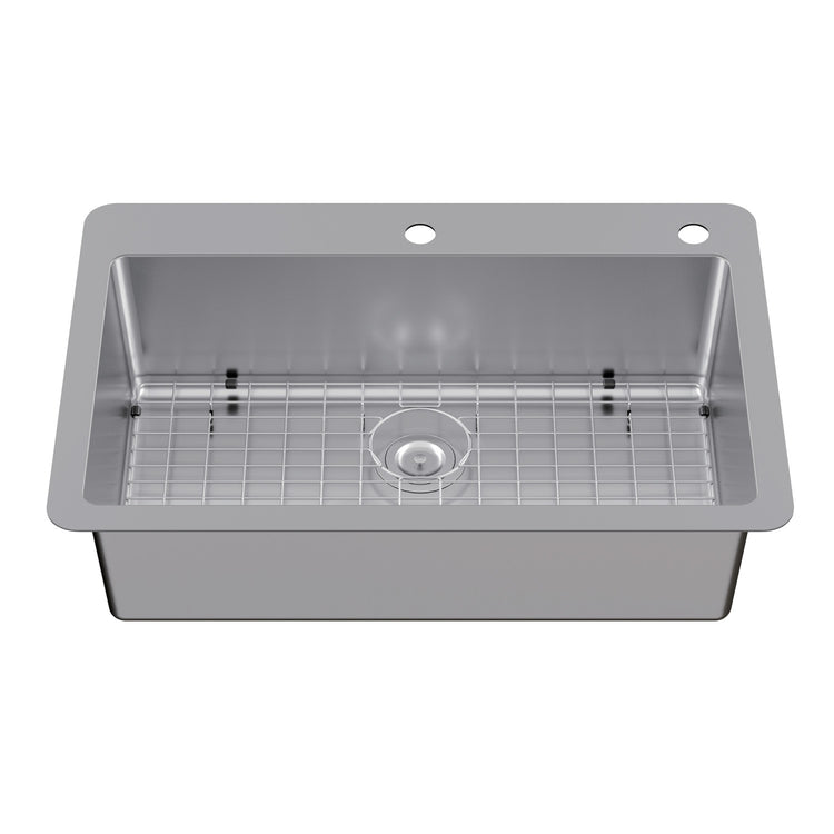The Calgary collection brings forth bold design and smooth lines, enhancing your contemporarily styled home. The Calgary 33" Stainless Steel Single Bowl Dual Mount Kitchen Sink with Drain, is constructed from high quality 18 Gauge, 18-10, 304 grade rust-resistant stainless steel. The brushed finish is also resistant to scratches, and with the sink's sound dampening technology, sound and vibrations are reduced. This sink comes predrilled for a single-hole faucet, along with an extra auxiliary hole for accessories like a water filtration faucet or soap dispenser. It's designed for installation as either an undermount or self-rimming drop-in option and the 9-inch deep single bowl enables you to handle any kitchen task with ease and confidence.