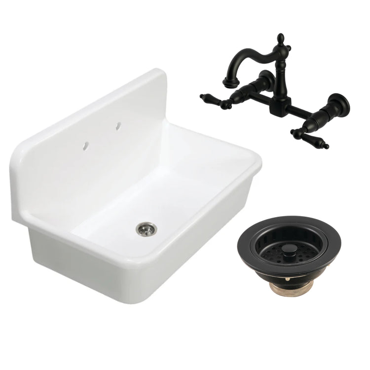Make a bold statement in your kitchen with the Arcticstone 36-inch top-mount sink bundle. Designed to combine traditional glamour with modern functionality, this set features a spacious white stone sink, a striking matte black wall-mount bridge faucet, and a matching matte black basket strainer for efficient water flow and debris control. Crafted from sturdy brass with swivel capabilities, the faucet offers a standout centerpiece with timeless styling, perfect for designs from Art Deco to Farmhouse. Together, the coordinated faucet and drain add a dramatic, sophisticated touch to your kitchen ensemble.