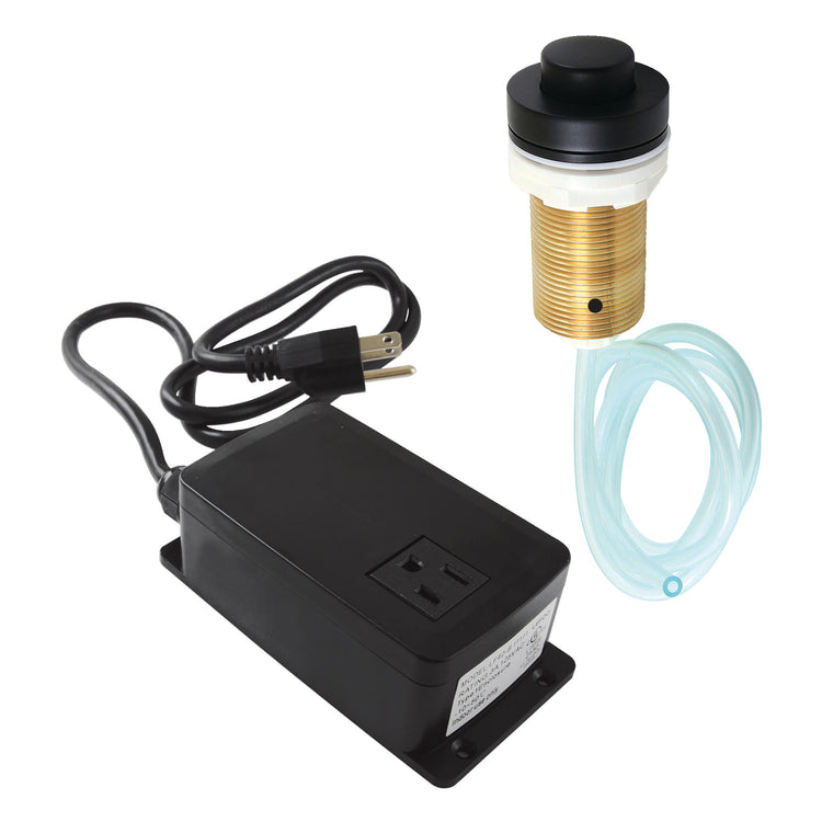 The disposal air switch button from Trimscape is a convenient and stylish means to activate your disposal. The button, which can be mounted to the sink or the countertop, connects to a hose which plunges air activating the disposal. The brass button is available in a multitude of finishes (chrome, brass, bronze, nickel) to complement the finish of your faucet and/or surrounding decor. This air switch kit includes: air switch button, air tube, and single outlet power module.