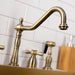 A lavish spark of traditionally stylized glamour is brought to your kitchen ensemble with this beautiful faucet. Able to fit a variety of sink set-ups, widespread kitchen faucets can be utilized in several multi-hole configurations. These are ideal for larger kitchens, as they are more spread apart, and with the included side-sprayer feature a 4-hole installation. The antique brass finish will also provide a long lasting and warm touch to your kitchen ensemble. Allow the brass construction to provide a sturdy and reliant fixture.