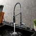 Transcend your home into a futuristic utopia with this faucet's brilliant craftsmanship and modern, curved spout with ergonomic levers. Designed for optimum versatility and functionality, the multiple spray settings and extendable spout of this pre-rinse faucet make for an enjoyable cleaning experience. Additionally, the rotating swivel spout leaves no area of the sink untouched as the industrial look of the exposed spring provides residential function. The polished chrome finish will also add a glistening elegance to your kitchen ensemble. Matching accessories are available for use.