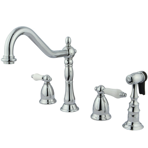 Original price $494.95 - Original price $494.95Original price $494.95$494.95$494.95 - $494.95Current price $494.95| /Kingston Heirloom KS1791PLBS - Heritage Double-Handle 4-Hole Widespread Kitchen Faucet with Brass Sprayer, Polished Chrome