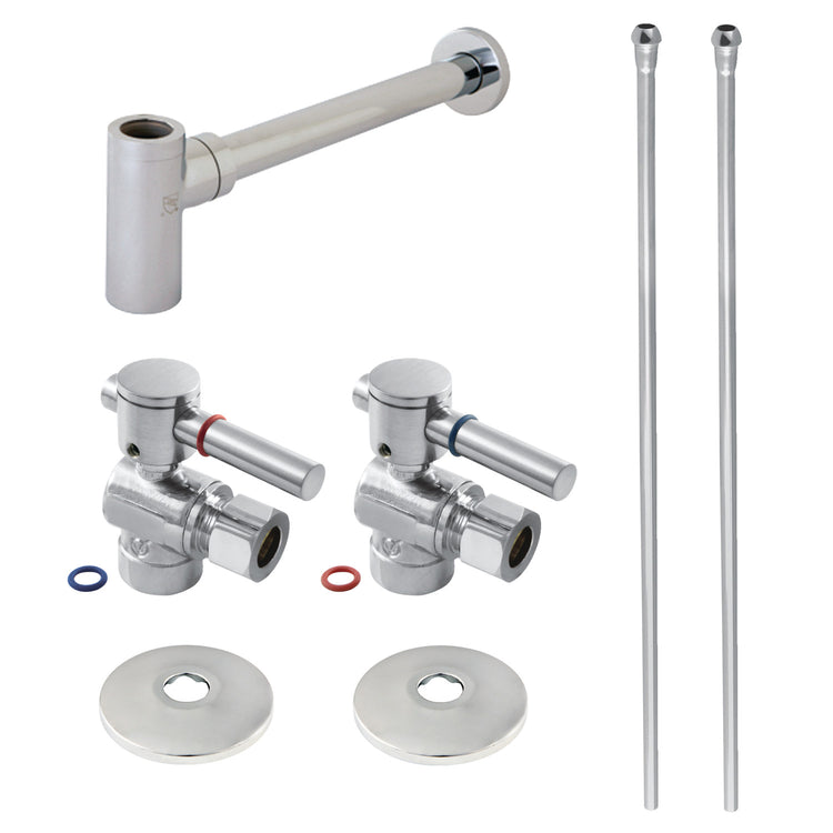 This 7-piece console sink plumbing kit from Kingston Brass provides all the necessary parts to elegantly finish the installation of your console sink. The set includes two 1/2 sweat inlet x 3/8" O.D. comp quarter turn angle stop valves, two low profile flanges, two pieces 3/8" x 30" bull nose rigid supply lines, one modern bottle style p-trap with flange, and angle stops include modern lever handle. Constructed of high quality brass and a tarnish-resistant finish, designed for long-lasting performance. Available in a variety of stunning finishes ready to match any home decor.